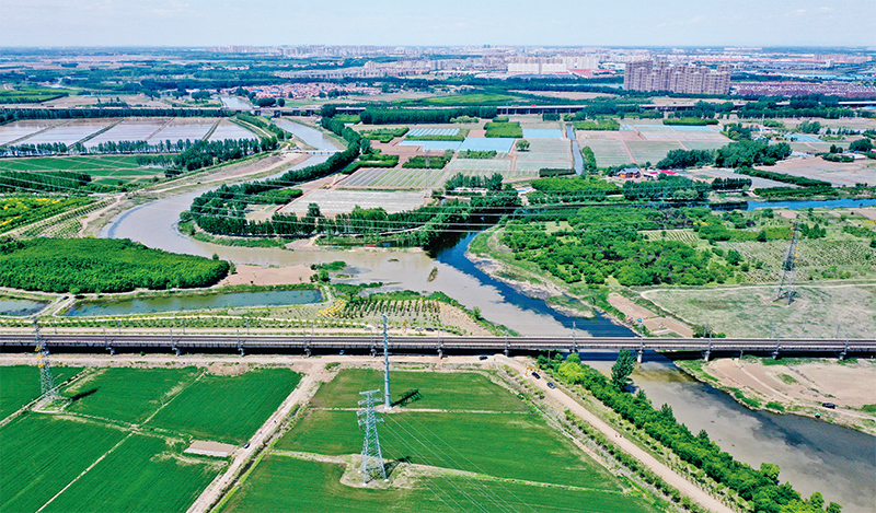 2022年5月12日,天津市境内的屈家店水利枢纽开闸放水,永定河865公里河道实现自1996年断流以来首次春季全线通水,并与全线贯通的京杭大运河实现世纪交汇,再现百年以来首次两水汇合景象。 水利部供图